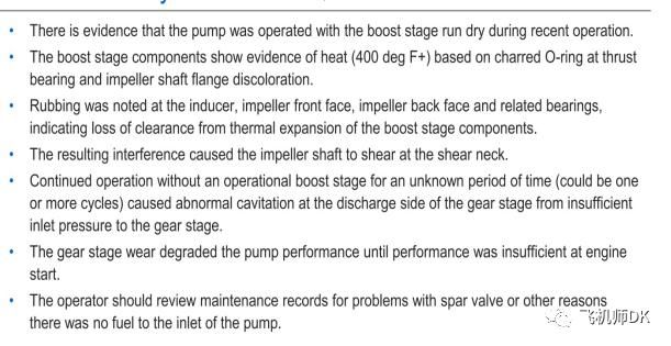 1、燃油泵增压级(BOOST STAGE)轴的剪切是因为没有燃油进入燃油泵而使泵干摩擦产生热膨胀导致间隙损失造成增压级轴剪切?还是因燃油泵增压级轴负载过大或轴本身缺陷而受力剪切?这需进一步对剪切断面进行分析。