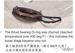 2、增压级部件有过热迹象(400华氏度以上),叶轮轴法兰变色、止动轴承处的O形封严圈烧焦。