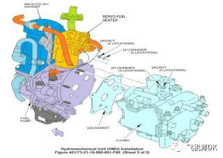 1、根据AMM和CMM手册描述,燃油泵安装在发动机左侧AGB上,燃油泵上部安装有主燃油/滑油和伺服燃油热交换器;燃油泵由主驱动轴带动齿轮泵(GEAR TSAG-高压级)的主动齿轮转动,主动齿轮中心花键连接增压级(BOOST STAGE)轴并带动叶轮转动,同时主动齿轮还连接一根小驱动轴并穿过增压级叶轮轴中心来驱动燃油泵后部安装的HMU内部超速保护机构(见下分解示图)。