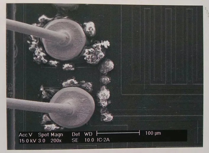 ??金属迁移----从键合焊盘处开始的金属枝晶生长,是一金属离子从阳极区向阴极区迁移的电解过程。