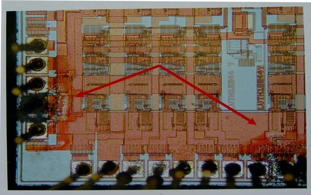 闩锁状态下器件在电源与地之间形成短路,造成大电流、过电应力和器件损坏