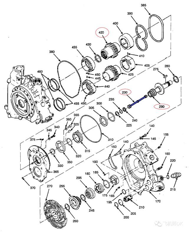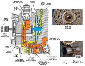 1、根据AMM和CMM手册描述,燃油泵安装在发动机左侧AGB上,燃油泵上部安装有主燃油/滑油和伺服燃油热交换器;燃油泵由主驱动轴带动齿轮泵(GEAR TSAG-高压级)的主动齿轮转动,主动齿轮中心花键连接增压级(BOOST STAGE)轴并带动叶轮转动,同时主动齿轮还连接一根小驱动轴并穿过增压级叶轮轴中心来驱动燃油泵后部安装的HMU内部超速保护机构(见下分解示图)。